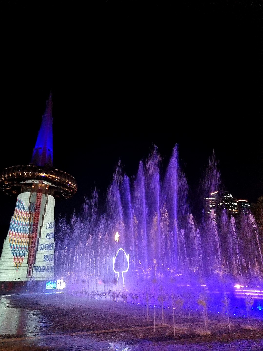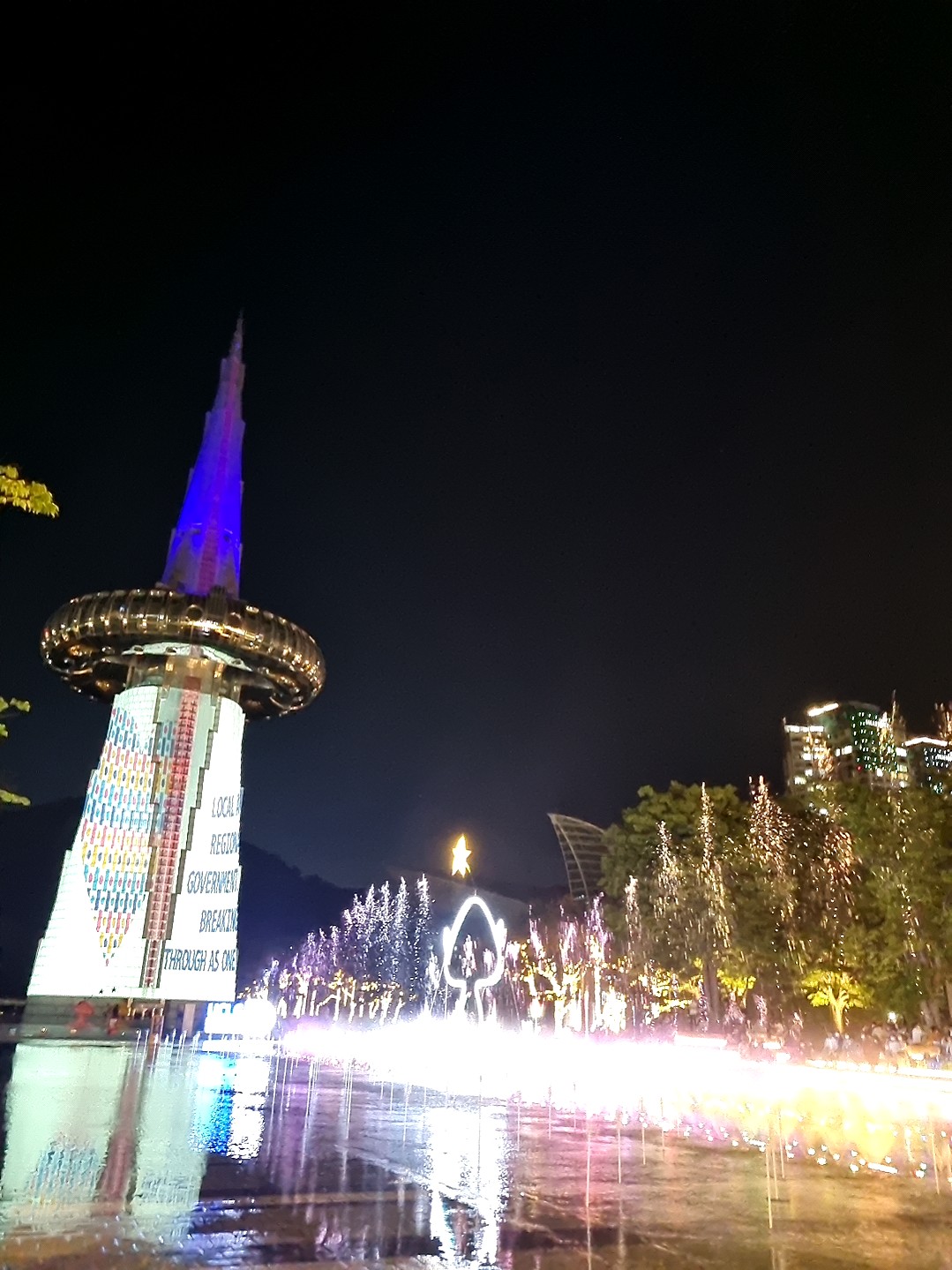 화려한 조명에 물줄기가 왔다갔다 하면서 색상도 여러색상으로 바뀌고, 물줄기가 키보다 훨씬 높게 품어져 나오는데